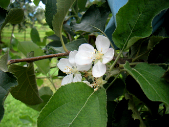 リンゴは5月に白い花を開花させ、マメコバチで受粉させます。昭和30年以前は人の手でひとつひとつ人工受粉をしていたそうですが、人手不足が深刻になり、このあたりではマメコバチ養蜂が定着しました。