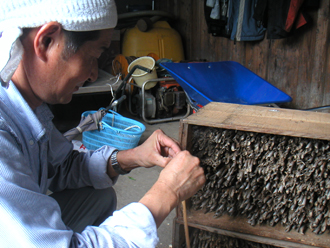 ハチの巣は、簡単な構造で束にした萱(かや)をリンゴ箱にぎっしりと詰めたものです。 |