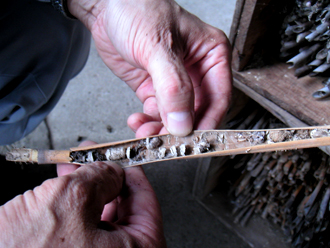 萱(かや)を割って開けてみると、そこには来年の春までの眠りについたハチの成虫が並んでいました。